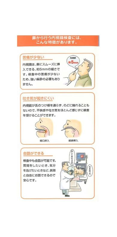 上部消化管内視鏡検査(胃カメラ)というと、苦しい、辛いとの先入観のある方や、いままで口からの内視鏡検査で辛い思いをされた方も多いかと思います。当院では、今までの口からの内視鏡に加えて、極細の経鼻内視鏡も採用しております。口からの内視鏡の方が詳細な観察が可能であることは確かですが、辛いので検査を受けないと言うことでは、どんなに高詳細な観察の出来る検査であっても意味がありません。経鼻内視鏡は、口からの内視鏡に比べて解像度は落ちますが、「内視鏡専門医」が検査を行う限りにおいては、診断率に差はないことが学会でも報告されています。また、両方の内視鏡で検査を受けられた方の9割の方が、次回の検査も「鼻から」を希望されることからも、スクリーニング検査としては経鼻内視鏡が有用であると考えられます。経鼻内視鏡が経口内視鏡より優れている点については、右の絵でご確認ください。